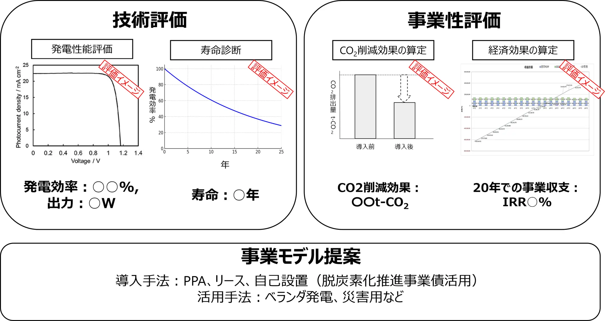 太陽光発電システムおよび新規環境技術の事業モデル構築、評価、検証において実績を有するSC企画社が事業性評価、事業モデル提案を担当いたします。PSCの開発者である桐蔭横浜大学の宮坂力氏が大学発ベンチャーとして立上げ、運営しているペクセル社が技術評価を担います。